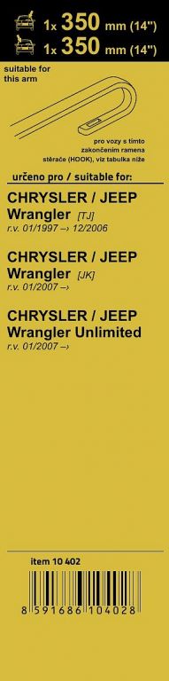 Sada dvou plochých stěračů FLAT (řidič + spolujezdec) se speciálním uchycením. Délky stěračů a systém uchycení na ramínko jsou přizpůsobeny vybraným vozům (viz tabulka použití). Vysoce kvalitní pružný člen plochého stěrače zajišťuje stejnoměrný tlak grafitového břitu v celé jeho délce.