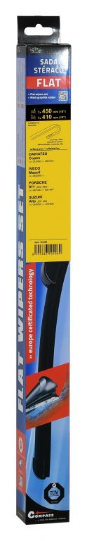 Sada dvou plochých stěračů FLAT (řidič + spolujezdec) se speciálním uchycením. Délky stěračů a systém uchycení na ramínko jsou přizpůsobeny vybraným vozům (viz tabulka použití). Vysoce kvalitní pružný člen plochého stěrače zajišťuje stejnoměrný tlak grafitového břitu v celé jeho délce.