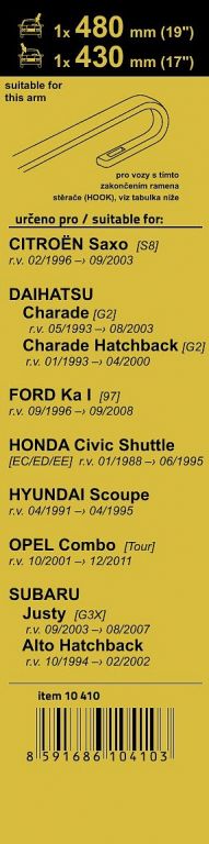 Sada dvou plochých stěračů FLAT (řidič + spolujezdec) se speciálním uchycením. Délky stěračů a systém uchycení na ramínko jsou přizpůsobeny vybraným vozům (viz tabulka použití). Vysoce kvalitní pružný člen plochého stěrače zajišťuje stejnoměrný tlak grafitového břitu v celé jeho délce.