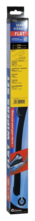 Sada dvou plochých stěračů FLAT (řidič + spolujezdec) se speciálním uchycením. Délky stěračů a systém uchycení na ramínko jsou přizpůsobeny vybraným vozům (viz tabulka použití). Vysoce kvalitní pružný člen plochého stěrače zajišťuje stejnoměrný tlak grafitového břitu v celé jeho délce.