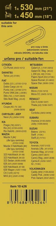 - určeno pro vozy: Aston Martin Cygnet 04/11 - Citroën C3-Pluriel [A42] 05/03 - 10/12 Daihatsu Terios [J2] 01/06 - Fiat Doblo [223..] 07/00 - 12/10 Fiat Doblo Cargo [223..] 07/00 - 12/10 Fiat Punto [188..] 07/99 - 12/11 Fiat Punto VAN [288..] 05/99 - Fiat Stilo [192..] 10/01 - 06/05 Fiat Stilo Multi Wagon [192..] 10/02 - 06/05 Hyundai Coupe [RD; FX; GK] 05/96 - 08/09 Chrysler / Jeep Neon [PL] 04/94 - 12/05 Kia Pregio [TB] 02/97 - Kia Rio [DC] 07/00 - 02/05 Kia Rio Hatchback [DC] 09/00 - 02/05 Mazda 3 [BK] (ramínko HOOK) 07/03 - 12/08 Mazda 626 [GF] 05/97 - 09/99 Mazda 3 Hatchback [BK] (ramínko HOOK) 07/03 - 12/08 Mazda 323 Hatchback [BG] 03/91 - 05/96 Mazda 323 Hatchback [BA] 06/94 - 09/00 Mazda 323 Sedan [BG] 06/89 - 04/98 Mazda 626 Hatchback [GF] 04/97 - 09/99 Mazda 626 Wagon [GW] 10/97 - 11/99 Mazda CX-3 [DK] 02/15 - Mazda MX3 [EC] 05/91 - 01/99 Mitsubishi Galant [E5...8; EA] 11/91 - 05/03 Mitsubishi Galant Station Wagon 10/96 - 09/02 Mitsubishi L 200 [KA, KB] 11/09 - Mitsubishi Pajero Sport [KH] 07/08 - Mitsubishi Space Runner 06/91 - 08/02 Mitsubishi Space Star [DG] 06/98 - 12/04 Nissan Micra [K12E] 11/02 - 10/10 Nissan Micra CC [K12E] 09/05 - 10/10 Renault Clio II [BB./CB./SB.] 03/98 - 10/07 Renault Thalia [LB] 10/99 - 10/07 Seat Cordoba [6L2] 09/02 - 04/06 Subaru Impreza [G12/G22] 01/93 - 09/00 Subaru Justy [MA; MS] 10/95 - 08/03 Suzuki Baleno [WB32, WB42] 03/16 - Suzuki Swift 11/04 - Suzuki Swift [Z] 11/14 - Toyota Avensis [T22] 10/97 - 01/03 Toyota Avensis Liftback [T22] 10/97 - 01/03 Toyota Avensis Wagon [T22] 10/97 - 01/03 Toyota Camry [V1; V2] 06/91 - 08/01 Toyota Camry Wagon [V1] 06/91 - 08/96 Toyota Carina E [T19] 02/92 - 10/97 Toyota iQ 11/08 - VW Caddy [9K9] 11/95 - 06/03 VW Caddy Pickup [9U7] 06/96 - 12/00 VW Polo Variant [6V5] 05/97 - 09/01
