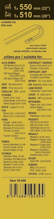 - určeno pro vozy: Alfa Romeo 156 Berlina [932] 10/97 - 12/05 Alfa Romeo 156 Cross Wagon Q4 10/04 - 12/05 Alfa Romeo 156 Sport Wagon [932] 06/00 - 12/05 Alfa Romeo 156 Sport Wagon Q4 10/04 - 12/05 Audi A8 [4D2; D2] 06/94 - 09/02 BMW X3 [E 83] 01/04 - 08/10 Cadillac SRX 09/03 - 08/09 Citroën Xsara [N6, N7] 07/97 - 12/05 Citroën Xsara Break [N6, N7] 10/97 - 03/10 Citroën Xsara Coupe [N6, N7] 07/97 - 12/05 Dacia Logan II [L8] 08/12 - 02/15 Fiat Brava [182..] 10/95 - 09/01 Fiat Bravo [182..] 10/95 - 09/01 Ford Cougar 08/98 - 12/00 Ford Mondeo III [01] 10/00 - 03/07 Ford Mondeo III Turnier [01] 10/00 - 03/07 Ford Tourneo Connect [02] 05/02 - 08/13 Ford Transit Connect 05/02 - 08/13 Honda Accord Aerodeck [CB/CC/CD/CE] 01/91 - 06/98 Honda Accord Coupe [CB/CC/CD/CE] 09/93 - 06/98 Honda Accord Sedan [CA/CB/CD] 01/91 - 12/99 Hyundai Grandeur New 09/92 - 03/99 Hyundai Grandeur XG New 03/02 - 06/05 Hyundai Santa Fe [SM] 09/99 - 12/05 Hyundai Sonata IV [EF] 04/01 - 01/05 Hyundai Terracan [HP] 01/01 - Hyundai XG [F] 12/98 - 12/05 Chevrolet / Daewoo Epica [V250] 06/06 - 12/11 Chevrolet / Daewoo Evanda [KL1L, V200] 03/03 - 09/06 Chrysler / Jeep Compass [MK, PK] 10/06 - Chrysler / Jeep Crossfire 03/02 - 08/08 Infiniti FX [S50] 11/02 - 06/08 Kia Magentis [GD] 09/00 - 12/05 Land Rover Freelander I [LN] 09/97 - 03/07 Lexus IS [E2] 08/05 - 04/13 Mazda MPV [LV] 07/94 - 05/99 Mitsubishi Pajero [V80, V90] 10/06 - Mitsubishi Space Wagon [N3] 06/92 - 11/00 Nissan Pathfinder [R50] 10/97 - 12/04 Peugeot 306 [N3] 01/93 - 04/97 Peugeot 306 [N5] 05/97 - 10/03 Peugeot 306 Break [N5] 05/97 - 03/02 Peugeot 306 Cabriolet [N3; N5] 01/93 - 10/03 Renault Megane I [X64] 01/96 - 10/02 Renault Megane I Cabrio [X64] 09/96 - 09/03 Renault Megane I Classic [X64] 09/96 - 09/03 Renault Megane I Coupe [X64] 01/96 - 10/02 Renault Megane I Grandtour [X64] 07/98 - 09/03 Renault Sandero [BS] 12/09 - Rover Serie 600 04/93 - 09/00 Subaru BRZ [Z10] 01/12 - Subaru SVX 09/92 - 12/96 Toyota GT86 04/12 -