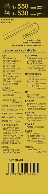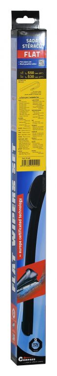 Sada dvou plochých stěračů FLAT (řidič + spolujezdec) se speciálním uchycením. Délky stěračů a systém uchycení na ramínko jsou přizpůsobeny vybraným vozům (viz tabulka použití). Vysoce kvalitní pružný člen plochého stěrače zajišťuje stejnoměrný tlak grafitového břitu v celé jeho délce.