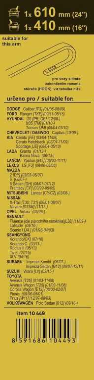 Délky stěračů a systém uchycení na ramínko jsou přizpůsobeny vybraným vozům (viz tabulka použití). Vysoce kvalitní pružný člen plochého stěrače zajišťuje stejnoměrný tlak grafitového břitu v celé jeho délce, což zamezuje rozmazávání nečistot a vytváření pruhů.