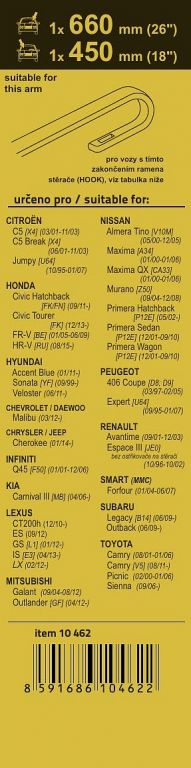 Délky stěračů a systém uchycení na ramínko jsou přizpůsobeny vybraným vozům (viz tabulka použití). Vysoce kvalitní pružný člen plochého stěrače zajišťuje stejnoměrný tlak grafitového břitu v celé jeho délce, což zamezuje rozmazávání nečistot a vytváření pruhů.