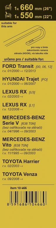 Délky stěračů a systém uchycení na ramínko jsou přizpůsobeny vybraným vozům (viz tabulka použití). Vysoce kvalitní pružný člen plochého stěrače zajišťuje stejnoměrný tlak grafitového břitu v celé jeho délce, což zamezuje rozmazávání nečistot a vytváření pruhů.