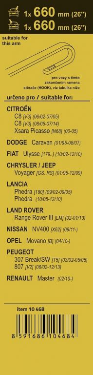 Délky stěračů a systém uchycení na ramínko jsou přizpůsobeny vybraným vozům (viz tabulka použití). Vysoce kvalitní pružný člen plochého stěrače zajišťuje stejnoměrný tlak grafitového břitu v celé jeho délce, což zamezuje rozmazávání nečistot a vytváření pruhů.