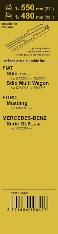 Délky stěračů a systém uchycení na ramínko jsou přizpůsobeny vybraným vozům (viz tabulka použití). Vysoce kvalitní pružný člen plochého stěrače zajišťuje stejnoměrný tlak grafitového břitu v celé jeho délce, což zamezuje rozmazávání nečistot a vytváření pruhů.