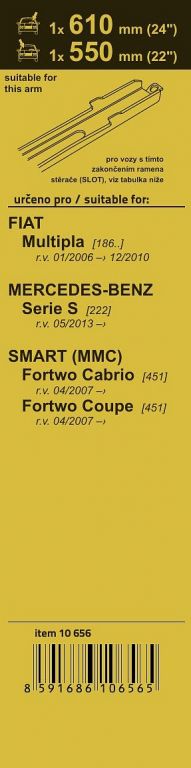 Délky stěračů a systém uchycení na ramínko jsou přizpůsobeny vybraným vozům (viz tabulka použití). Vysoce kvalitní pružný člen plochého stěrače zajišťuje stejnoměrný tlak grafitového břitu v celé jeho délce, což zamezuje rozmazávání nečistot a vytváření pruhů.