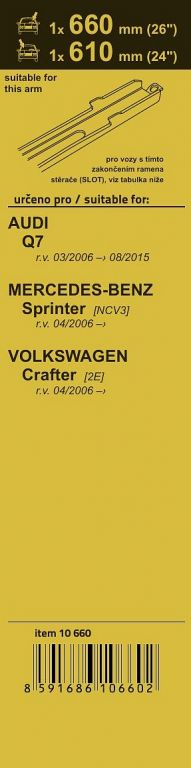 Délky stěračů a systém uchycení na ramínko jsou přizpůsobeny vybraným vozům (viz tabulka použití). Vysoce kvalitní pružný člen plochého stěrače zajišťuje stejnoměrný tlak grafitového břitu v celé jeho délce, což zamezuje rozmazávání nečistot a vytváření pruhů.