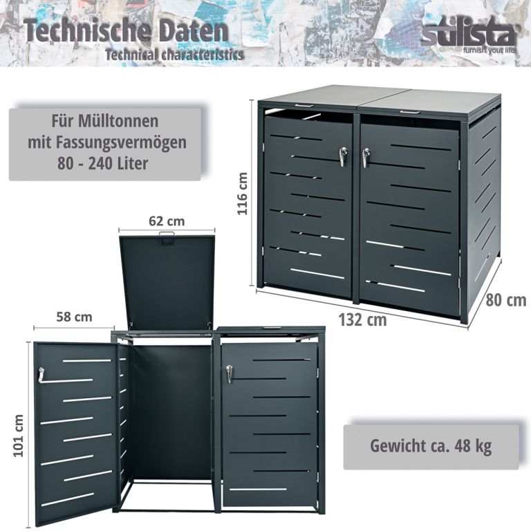 STILISTA Skříň na 2 popelnice, 132 x 80 x 116 cm, antracit