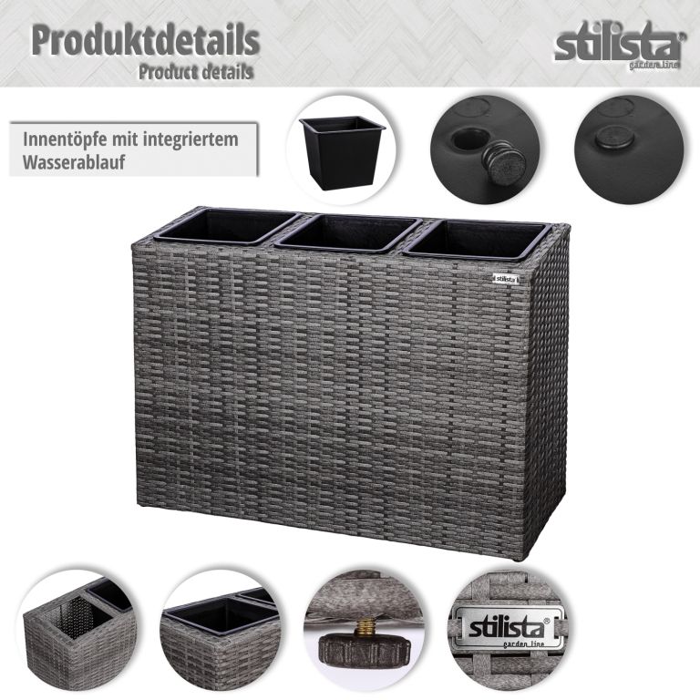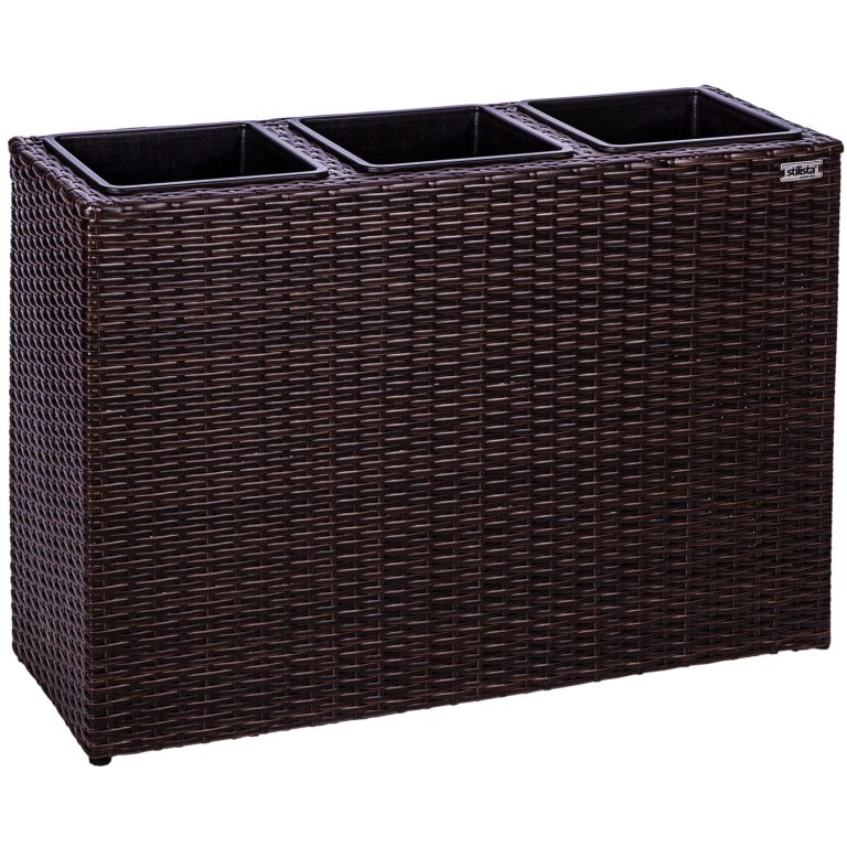 Nádherný stojan na tři květináče je skutečným lákadlem pro váš domov. Stojan s vnitřními květináči je ideální pro výsadbu na zahradě, balkoně nebo terase, lze použít také jako rozdělovač místností. Materiál vás přesvědčí svými vynikajícími vlastnostmi: je odolný vůči povětrnostním vlivům, UV záření, odpuzuje nečistoty a snadno se čistí. Vyjímatelné vnitřní květináče jsou vybaveny uzavíratelným odtokem vody, který zabraňuje přemokření.