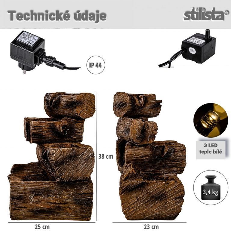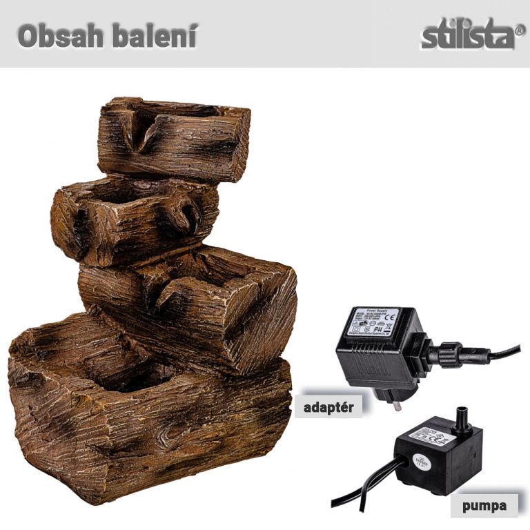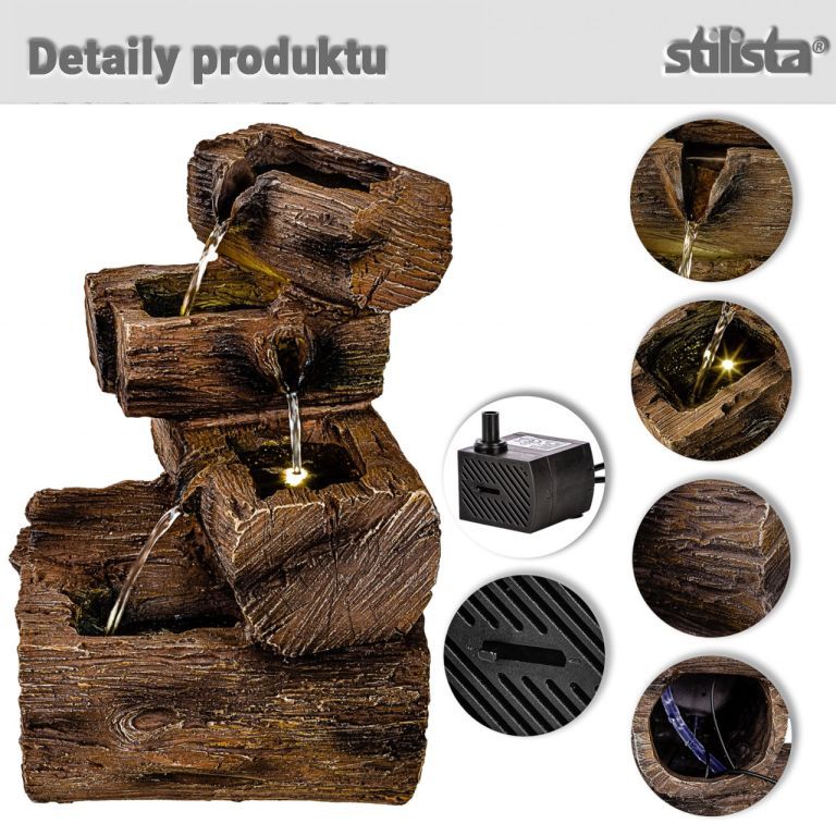 Dekorativní fontána "Dřevěné kmeny" promění Vaši zahradu nebo terasu v oázu pohody. Součástí je plynule nastavitelné čerpadlo s hladkým chodem, díky kterému voda teče v okruhu, takže není nutné přípojení vody z řádu. Fontána je vyrobena z kvalitního polyresinu odolného vůči povětrnostním vlivům a UV záření.