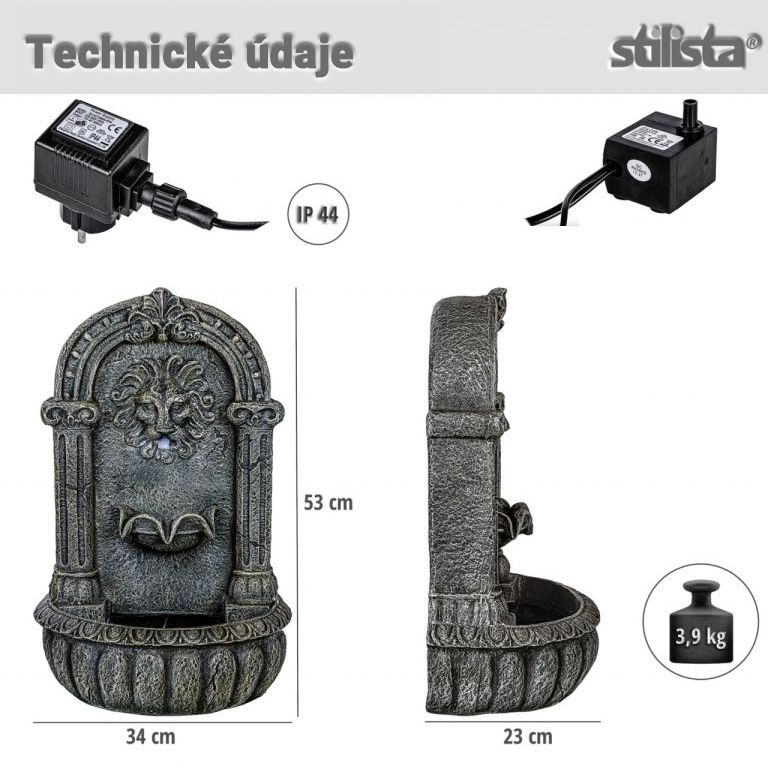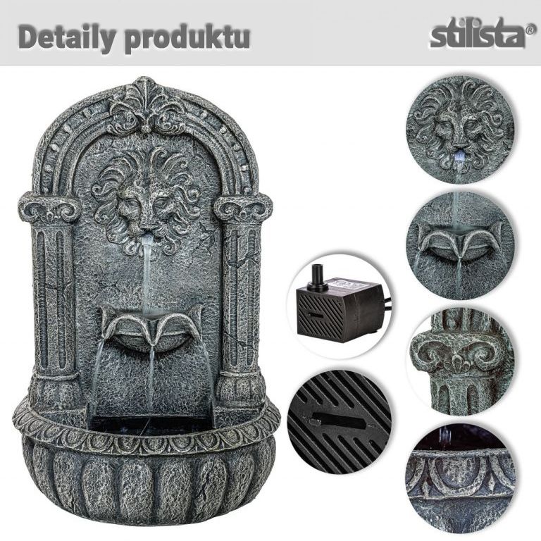 Dekorativní fontána "Lví hlava" k montáži na stěnu promění Vaši zahradu nebo terasu v oázu pohody. Součástí je plynule nastavitelné čerpadlo s hladkým chodem, díky kterému voda teče v okruhu, takže není nutné přípojení vody z řádu. Fontána je vyrobena z kvalitního polyresinu odolného vůči povětrnostním vlivům a UV záření.