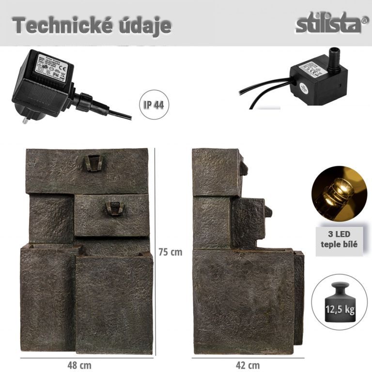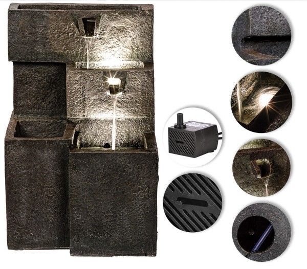 Díky plynulému chodu vodního čerpadla teče voda v okruhu, takže není nutné žádné připojení vody. Fontána je vyrobena z vysoce kvalitního polyresinu odolného proti povětrnostním vlivům a UV záření. Součástí dodávky je plynule nastavitelné čerpadlo, takže průtok lze přizpůsobit vašim přáním.