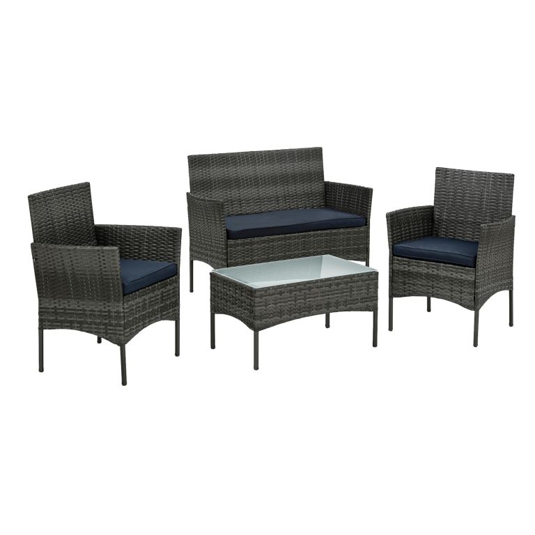 Čtyřdílná souprava, která se skládá ze zahradního stolu, dvoumístné lavice a dvou zahradních židlí, je vyrobena z ručně tkaného polyratanu. Náš zahradní set je vhodný na terasu, zahradu, zimní zahradu nebo balkon a hodí se do každého interiéru. Robustní ocelová konstrukce je obalena polyratanovým proutím odolným proti povětrnostním vlivům a UV záření. Stůl v našem obývacím pokoji má krásnou desku z matného skla. Díky povrchu odpuzujícímu nečistoty se sedací souprava snadno čistí, potahy polštářů jsou navíc snímatelné, pratelné a vodoodpudivé.