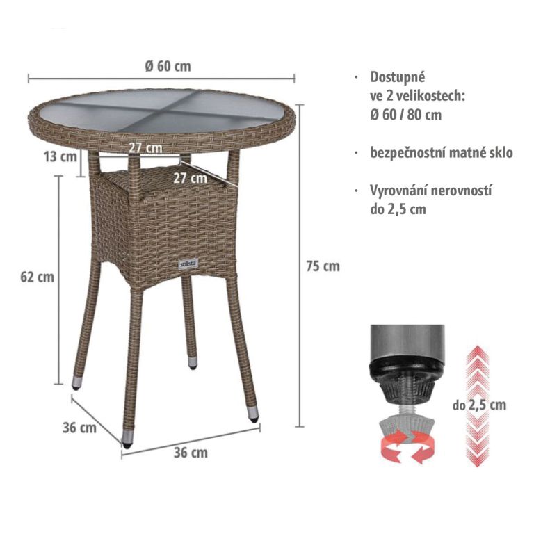 Zahradní stolek s deskou z matného skla je vyroben z polyratanu a má pevný ocelový rám s práškovým nástřikem. Robustní ocelová konstrukce je obalena do polyratanového výpletu odolného proti povětrnostním vlivům a UV záření. Spodní patro stolku pak poskytuje další odkládací prostor. Díky předmontovaným vyrovnávacím šroubům lze stolek velmi snadno vyrovnat a umístit na jakýkoliv povrch. Je vhodný pro vnitřní i venkovní použití.