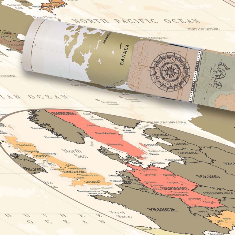 Unikátní mapa ve stylu Vintage retro a vzhledu staré vybledlé mapy s mnoha detaily, které tento efekt působivě posilují. Prémiová kvalita, 100% navrženo a vyrobeno v Německu a pokryto vysoce kvalitním stíracím lakem. Stimuluje představivost: Představte si, že budete moci sledovat své cesty, aniž byste museli psát do deníku. Zároveň vytvoříte vizualizovanou nástěnnou výzdobu, která na první pohled zobrazí vaše minulé výlety.