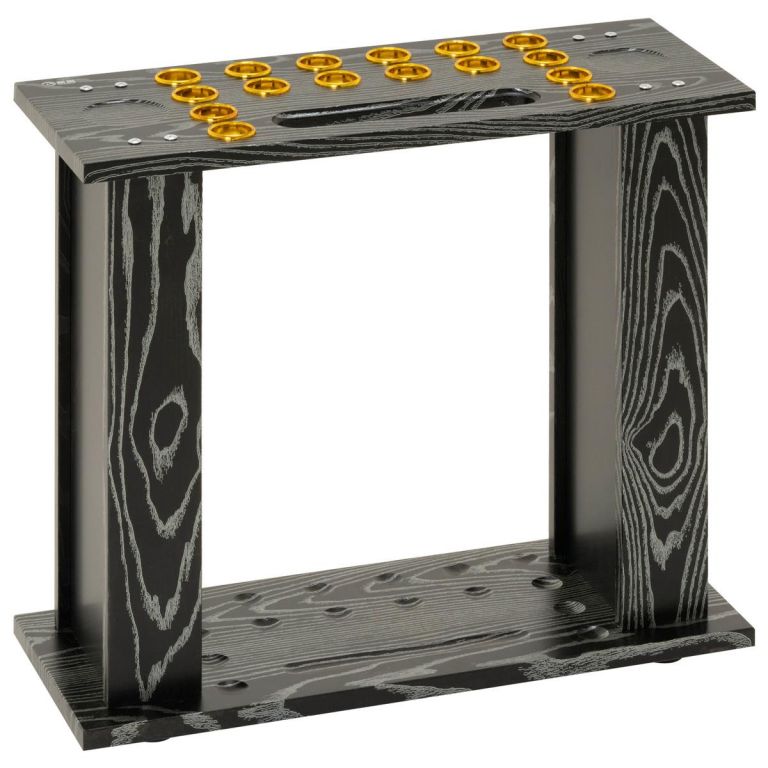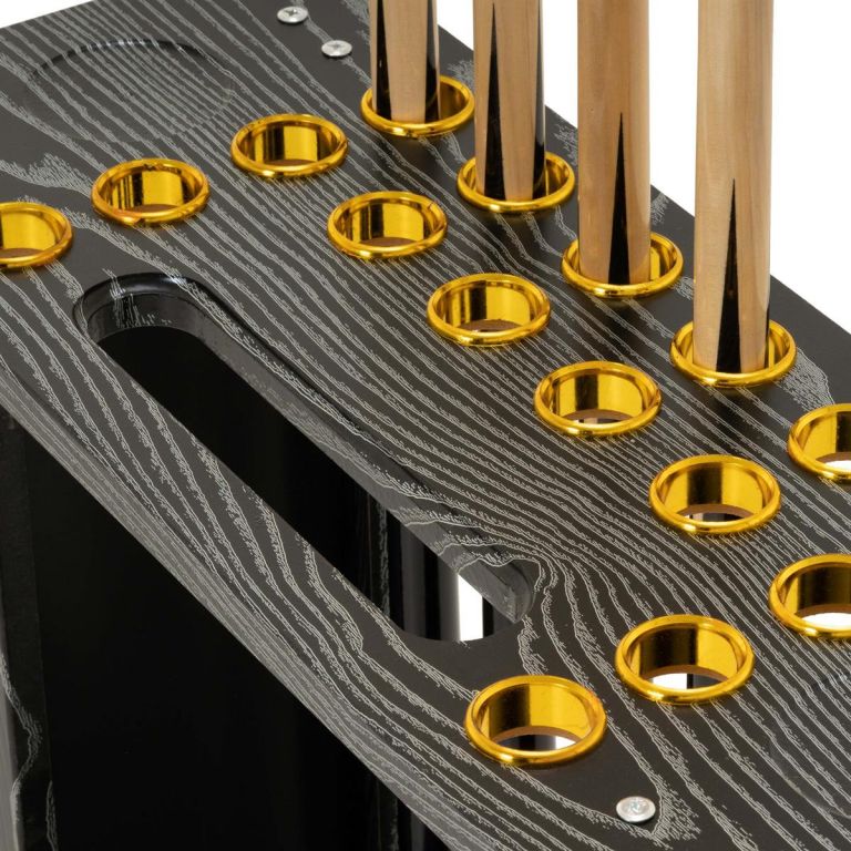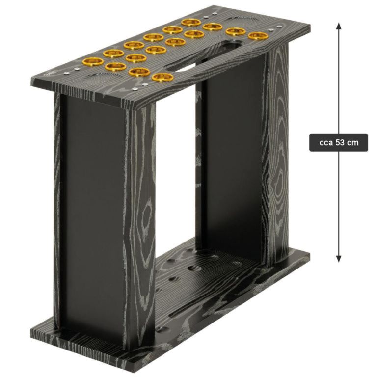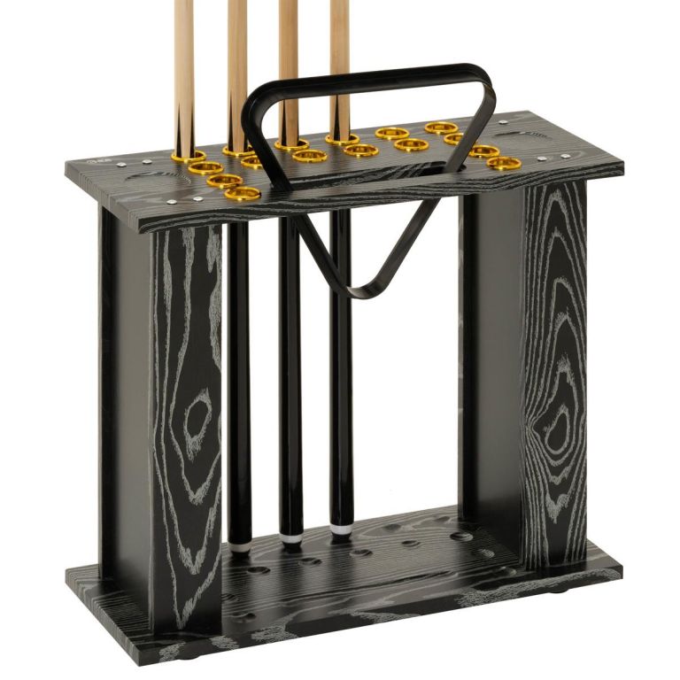 Stojan nabízí prostor pro tága, kulečníkový trojúhelník a má výklenky pro 2 nápoje nebo jiné předměty, například popelníky. Spodní drážka dokonale přiléhá k horní prohlubni a zajišťuje pevné uchycení tága. Volně stojící, stabilní stojan na tága lze individuálně umístit a polohovat na rozdíl od nástěnných držáků a nevyžaduje žádnou další montáž. Elegantní povrch stojanu na tága je voděodolný a odolný proti poškrábání, takže na něj lze bez obav umístit příslušenství, jako jsou kulečníkové křídy a kartáče. Držák na tágo je dokonalým doplňkem, ať už jde o profesionálního sportovce, amatéra nebo příležitostného hráče v hospodě. Díky svému modernímu designu působí stojan na tága také ušlechtilým optickým dojmem, ať už se nachází v herně, obývacím pokoji, party sklepě, baru nebo herním salonu. Pogumované nožičky chrání zejména podlahu.