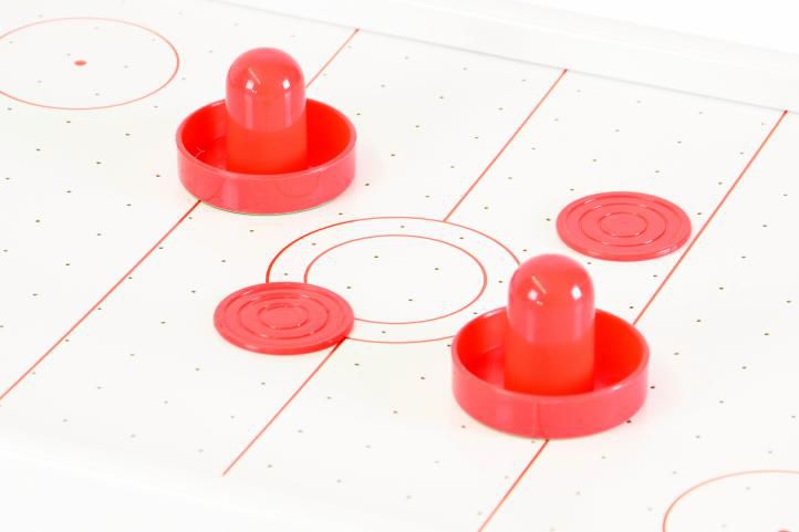 Prostřednictvím vzduchu, proudícího speciálními otvory v hracím poli směrem nahoru, se puk pohybuje na vzduchovém polštáři. S pálkou se pokoušíte zasáhnout soupeřovu branku. S praktickými manuálními počítadly branek si může každý hráč reprezentovat aktuální skóre.
