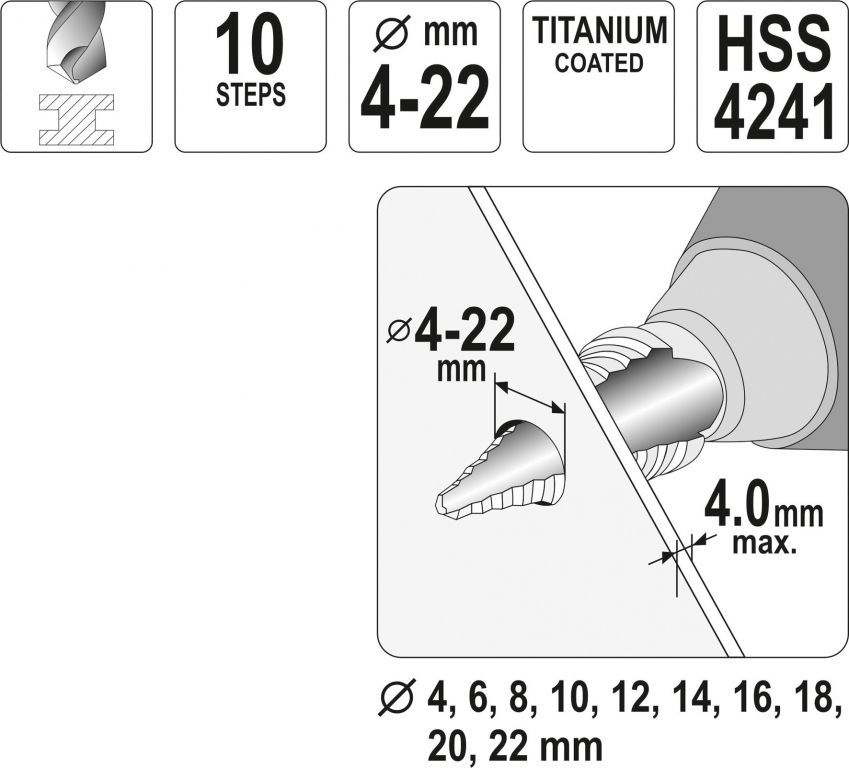 Každý jednotlivý stupeň může vrtat otvor do maximální hloubky 4 mm. Celkově je vrták vybaven 10 stupni o průměrech 4; 6; 8; 10; 12; 14; 16; 18; 20 a 22 mm.