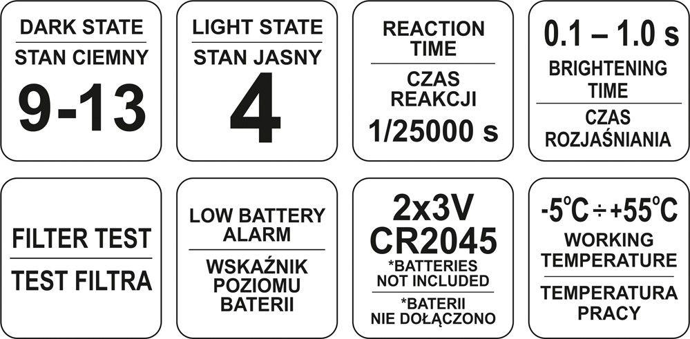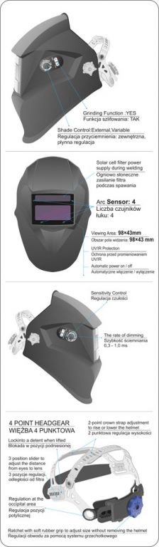 Perfektně navržená helma s dokonalým designem, která vás zajisté nadchne! Chrání celou hlavu a hlavně obličej při svařování, především vaše oči náchylné na škodlivé záření. Proto je helma vybavena samostmívacím filtrem s velmi rychlou reakční dobou, který poskytuje ochranu proti ultrafialovému a infračervenému záření. Nastavení citlivosti je velmi hladké a plynulé, výhodou je nastavení rychlosti ztmavování. Přilba je napájena ze dvou 3V baterií nebo solárním článkem. Disponuje skvělým nastavením čelenky, která padne na jakýkoliv typ hlavy a je zaručen maximální komfort při nošení