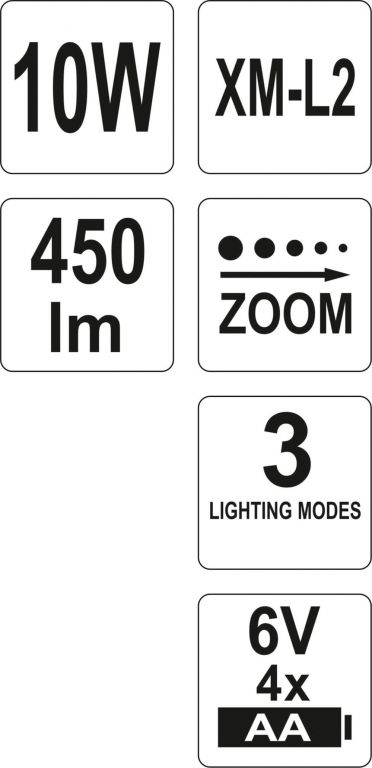 Svítilna je vybavena funkcí ZOOM, která umožňuje regulovat paprsek světla a tím osvětlovat blízké, nebo vzdálené objekty. Také disponuje třemi různými režimy světla (plné 100%, úsporné 50% a blikání SOS). Napájení 4x baterie AA (nejsou přiloženy) v pouzdře na zadní straně hlavy. Upevňovací popruhy na hlavu lze pomocí přezek upravit dle potřeby.