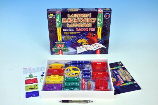 Elektronická stavebnice, ze které lze sestavit dle návodu až 80 projektů. Děti si mohou sestavit vlastní FM rádio. Běhěm hry děti poznají práci motoru, přepínačů nebo zdrojů zvuku a světla.V krabici 30x24,5x3,5 cm.Vhodné od 6 let.