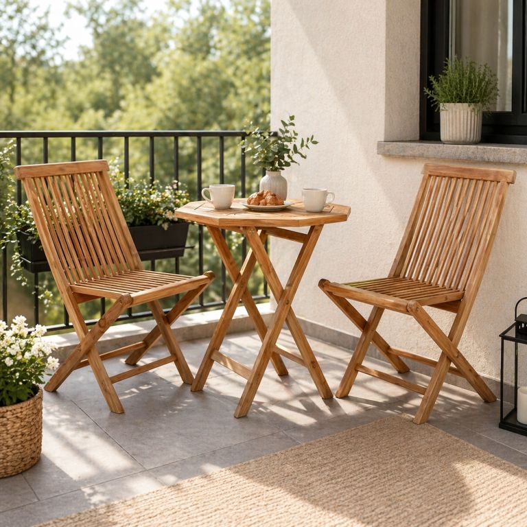 Sestava obsahuje 2 skládací zahradní židle a 1 kompaktní osmihranný stůl o průměru 60 cm. Nábytek je vyrobený z masivního ošetřeného teaku, který patří mezi odolná tvrdá dřeva vhodná pro venkovní použití. Židle mají výšku sedu cca 46 cm, laťkové sedáky a opěrky pro pohodlné sezení. Díky možnosti složení se set snadno uklízí mimo sezónu nebo ve chvíli, kdy potřebujete uvolnit místo na balkoně.