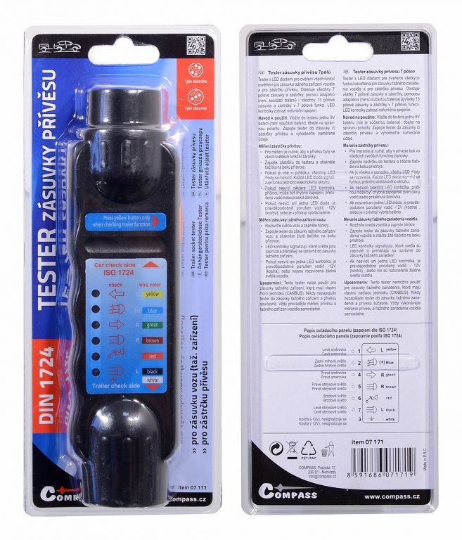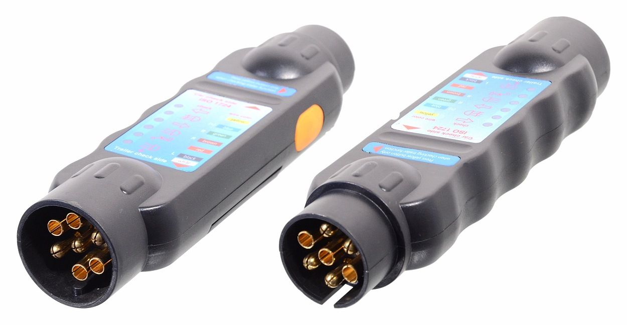 Tester s LED diodami pro ověření všech funkcí osvětlení pro zásuvku tažného zařízení vozidla a pro zástrčku přívěsu. Otestuje všechny 7 pólové zásuvky a zástrčky; pomocí adaptérů (není součástí balení) i všechny 13 pólové zásuvky a zástrčky v 7 pólové funkci. LED kontrolky zobrazí nefunkční spojení.