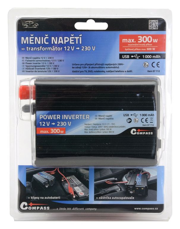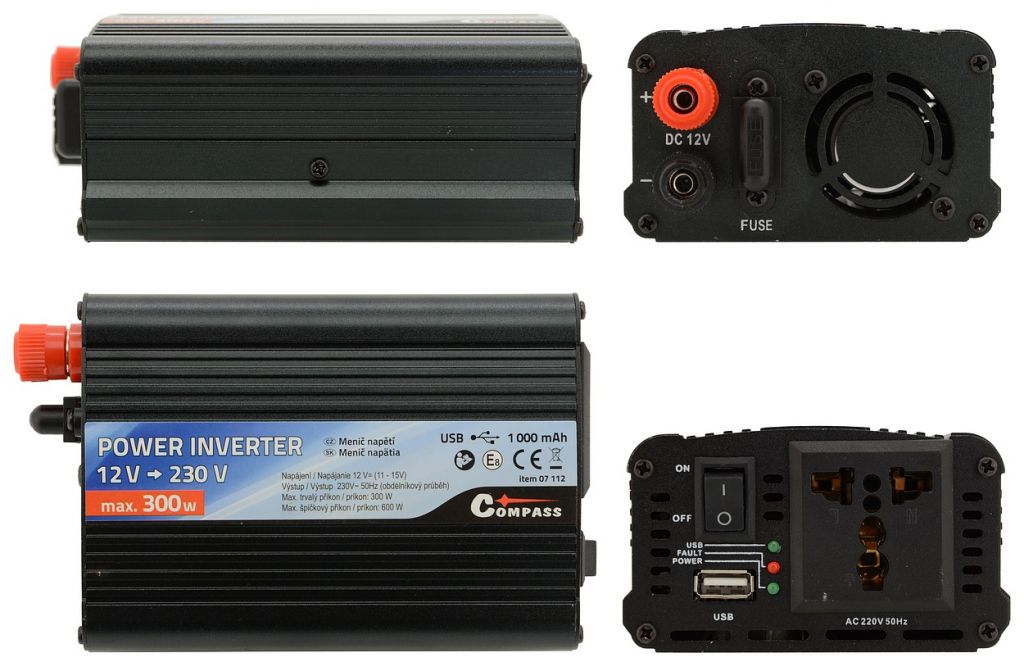 Připojení napájecího napětí je řešeno zástrčkou do zásuvky automobilového zapalovače 12V, nebo pomocí klipsů z akumulátoru 12V. Výstup měniče je osazen běžnou zásuvkou 230V evropského typu pro spotřebiče bez zemnícího kolíku tj "dvoukolíková" zástrčka. Navíc je k dispozici USB zásuvka, vhodná pro MP3 přehrávače, mobilní telefony a další zařízení, která se nabíjejí, či napájejí běžným USB zdrojem 5V až do příkonu 1000mA. Dále je měnič vybaven vypínačem, kontrolkami provozu a signalizací nežádoucích stavů.