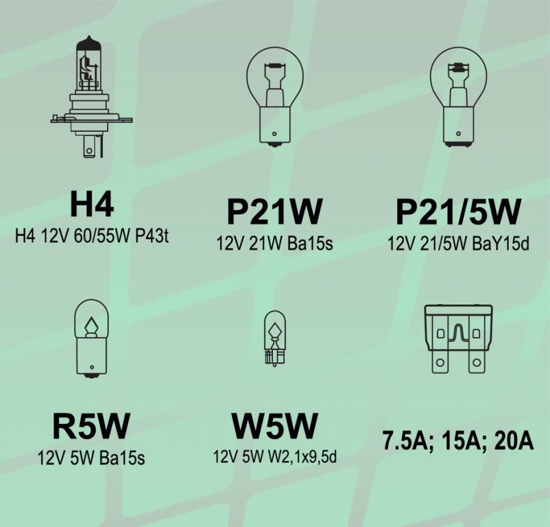 Univerzální servisní sada žárovek a pojistek v plastové krabičce. Sada je složena z nejběžnějších nožových pojistek a 12 V žárovek.