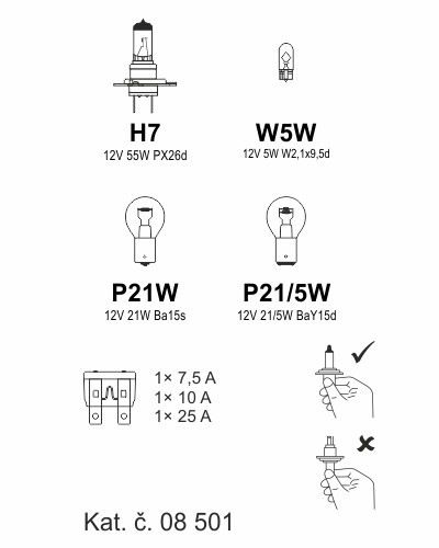 Náhradní autožárovky a pojistky uložené v servisním plastovém boxu z PVC.