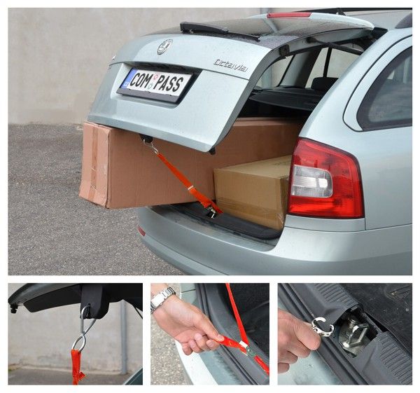 Popruh je vybaven okem pro upnutí do jedné a karabinou do druhé části zámku dveří a sponout pro dotažení. Návod k použití: Kovové oko popruhu zavěste (zacvakněte) do zámku na zadních dveřích a druhou část upevněte pomocí karabiny k uzavíracímu mechanismu. Nakonec popruh přitáhněte pomocí spony v prostřední části.