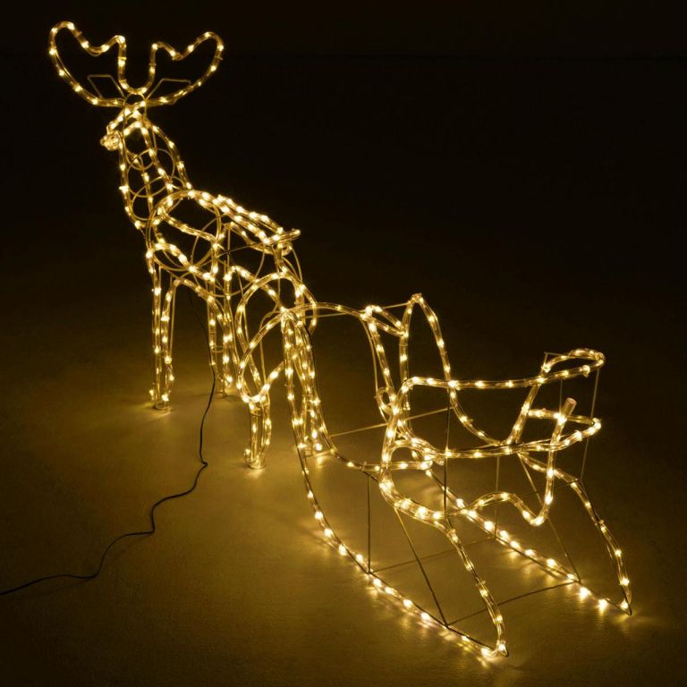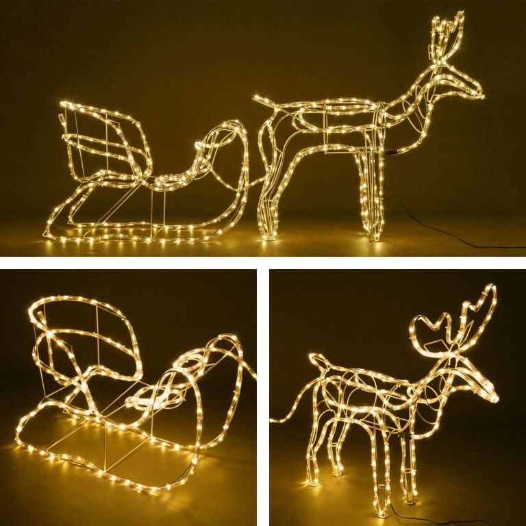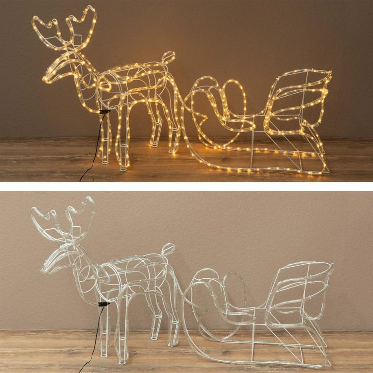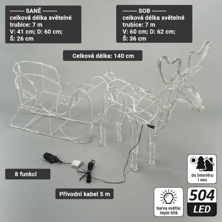 Detailně propracované sobí sáně s celkem 504 bíle svítícími LED diodami dodávají spoustu vánoční atmosféry. 8 funkcí s paměťovou funkcí umožňuje pestrý program osvětlení. K dispozici je následujících 8 funkcí: 1. kombinace (všechny typy funkcí se střídají), 2. střídavé pomalé/rychlé blikání, 3. blikání se zvyšuje, 4. pomalé stmívání, 5. pomalu bliká, 6. rychlé stmívání, 7. rychle bliká, 8. stabilní. Přibližně 36 LED diod na metr (= celkem přibližně 504 LED diod), spotřeba energie max. 6 Wattů.