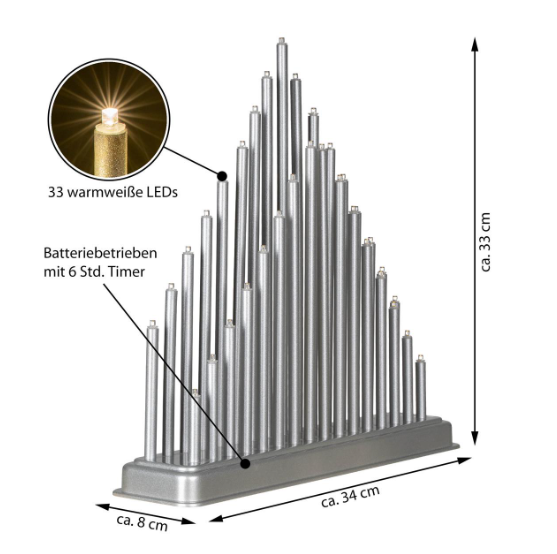 Designový a elegantně řešený svícen s 33 LED diodami vykouzlí romantickou atmosféru nejen o Vánocích. Díky napájení AA bateriemi můžete svícen umístit, kamkoliv si vzpomenete, nejste limitováni rozmístěním zásuvek ve Vašem bytě.