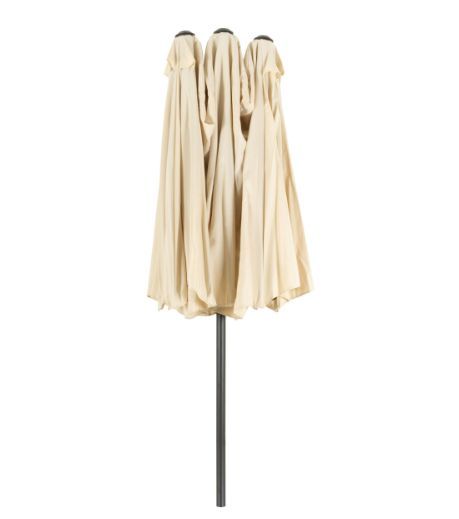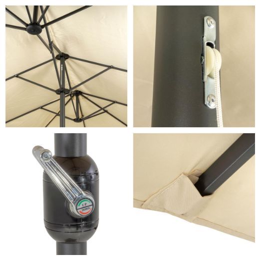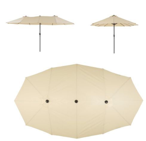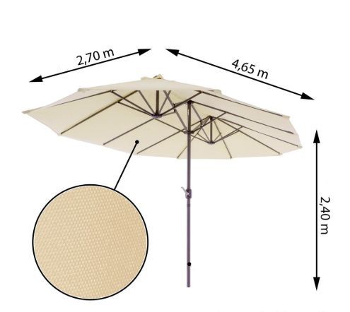 Obrovský slunečník pro vaši zahradu, balkon, bazén nebo terasu. Díky své velikosti nabízí více stínu než markýza nebo plážový slunečník a lze je v případě potřeby přepravovat a uskladnit. Podlouhlá oválná konstrukce slunečníku je rovnoměrně tažena dvanácti ocelovými žebry, které dávají dvou střechám slunečníku potřebné napětí. Zahradní slunečník je dodáván bez stojanu. Pro tento slunečník byste měli zvolit stojan na slunečníky o minimální hmotnosti 40 kg. Ve větrnějších lokalitách dejte přednost ještě těžšímu.