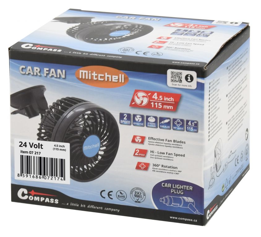 Praktický ventilátor s robustní konstrukcí. Napájení 24 V je možné ze zásuvky autozapalovače. Ventilátor disponuje dvěma rychlostmi a díky kulovému kloubu je snadné větrák natočit prakticky jakýmkoliv směrem.