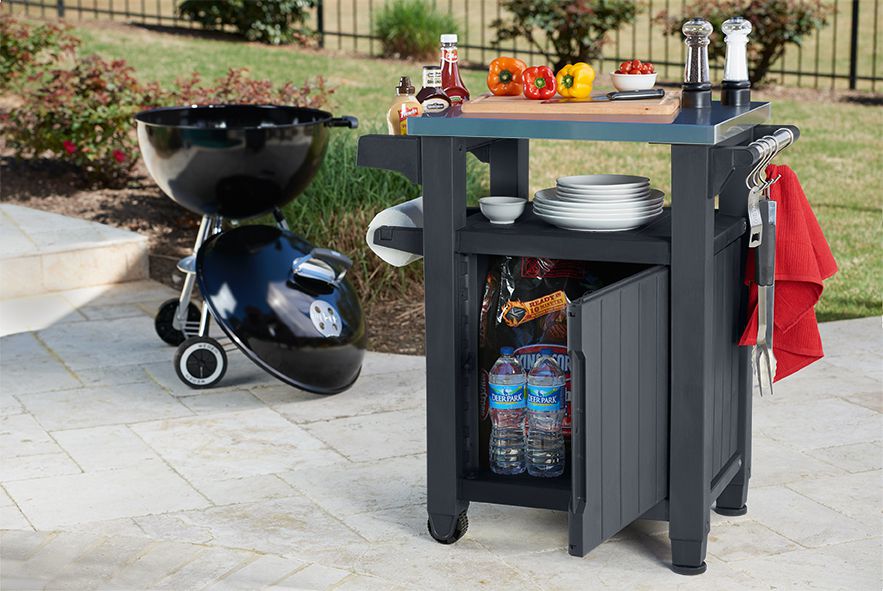 Multifunkční úložný stůl - ideální při grilování, sázení rostlin apod.- vše máte ihned k dispozici snadná montáž plast + kovová deska.