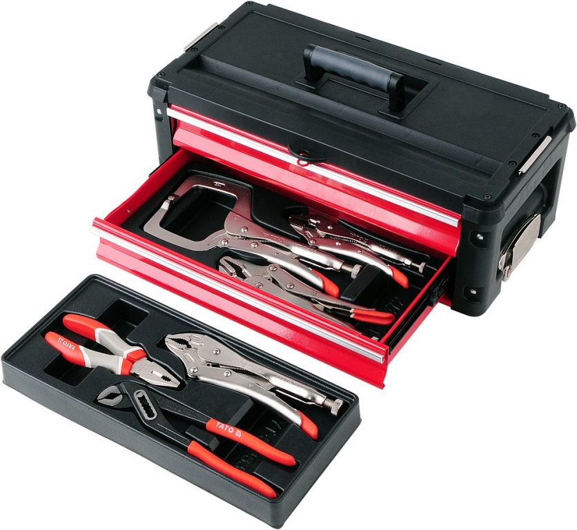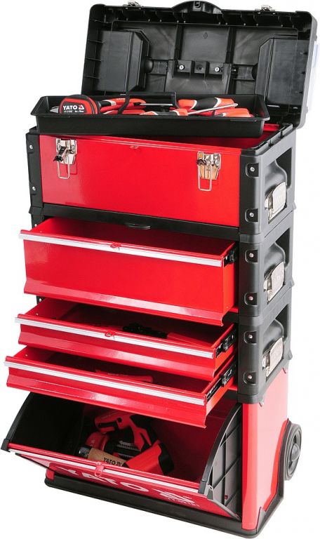 Třídílná servisní skříň s vestavěnými kolečky a teleskopickou rukojetí, pro snadné přenášení uloženého nářadí. Horní modul je uzavratelný pomocí dvou kovových spon, které je možné uzamknout pomocí zámku (není součástí). Navíc je opatřen dvěma plastovými kufříky na drobné součásti. Centrální modul má dvě kovové zásuvky. Spodní modul je velmi objemný a má vysokou nosnost.