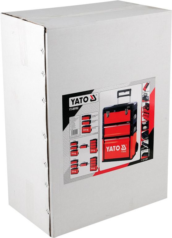 Třídílná servisní skříň s vestavěnými kolečky a teleskopickou rukojetí, pro snadné přenášení uloženého nářadí. Horní modul je uzavíratelný pomocí dvou kovových spon, které je možné zamknout pomocí zámku (není součástí). Navíc je opatřen dvěma plastovými kufříky na drobné součástky. Centrální modul má jednu kovovou zásuvku. Spodní modul je velmi objemný a má vysokou nosnost. Skříň lze lehce rozložit na jednotlivé díly, nebo doplnit o další modul (YT-09107, YT-09108).