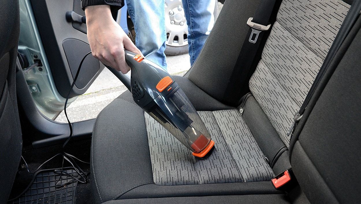 Přenosný vysavač s dlouhým kabelem a se zástrčkou do zásuvky automobilového zapalovače 12 V.