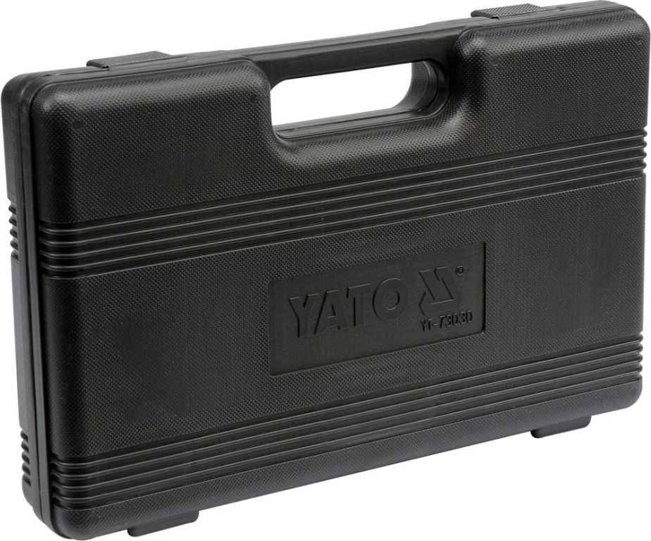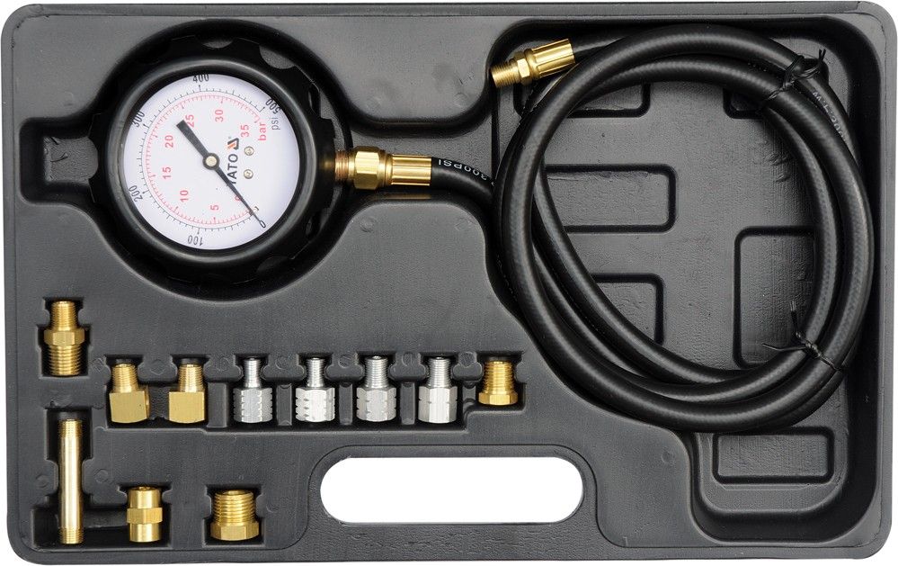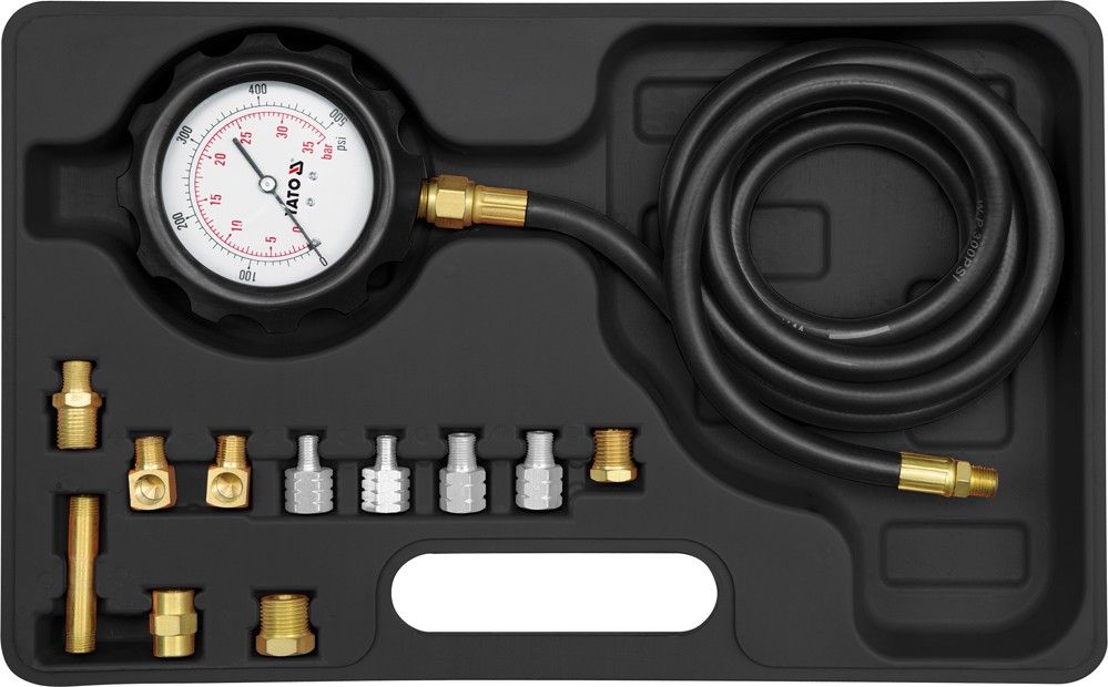 Profesionální tlakoměr oleje od značky YATO. Dodává se s redukcemi pro přizpůsobení rozchodu u většiny motorů. Měřič je vybaven speciálním gumovým krytem. Vše je přehledně uloženo v plastovém kufru.
