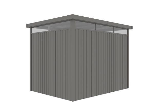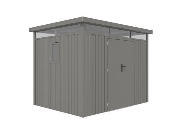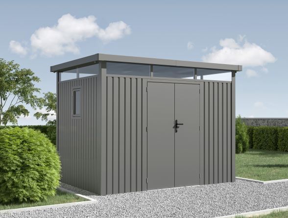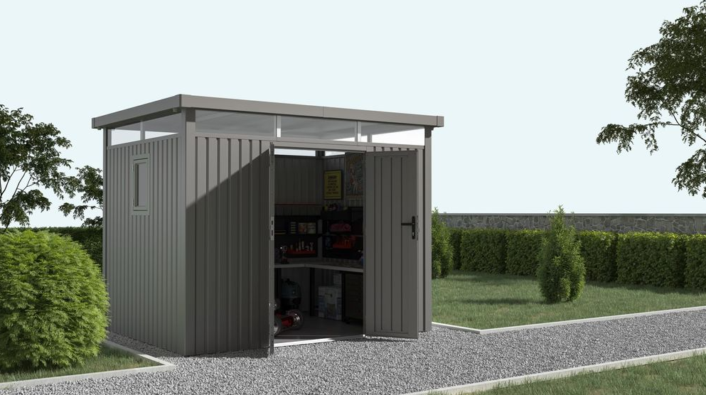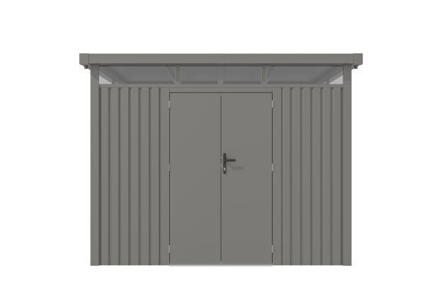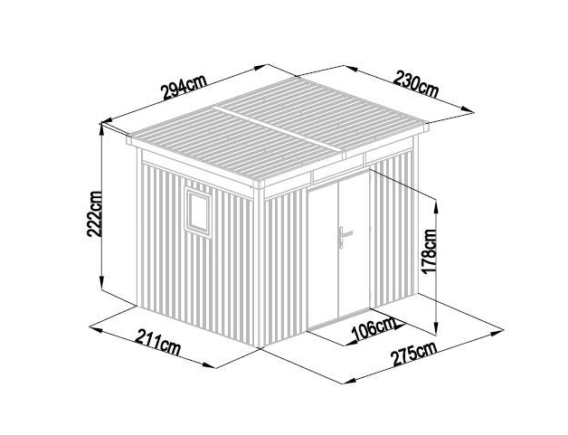 Zahradní domek v moderním designu se hodí do každé zahrady. Domek má dvojité křídlové dveře, které lze uzamknout. Vyroben z kvalitních ocelových plechů tloušťky 0,4 mm a kvalitního rámu zpozinkované oceli tloušťky 0,5 - 1,2 mm. Maximální zatížení střechy sněhem je 60 kg/m2. Jedno otevíratelné okno. Prosvětlené vrchní části panelů. Systém rychlého odvodu deště.