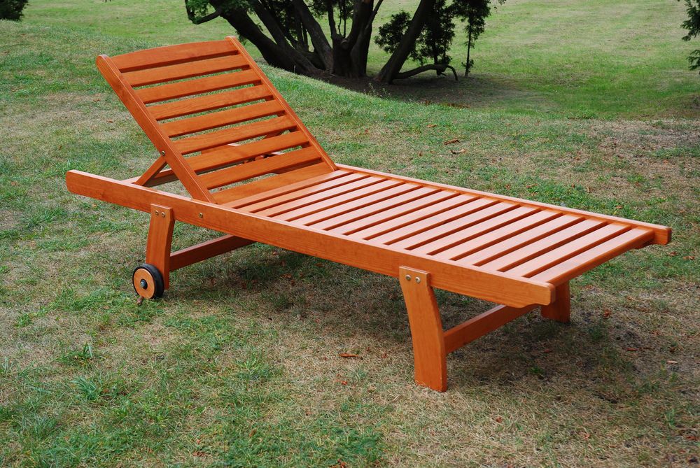 Stabilní polohovací zahradní lehátko z lakovaného borovicového dřeva.