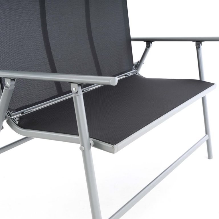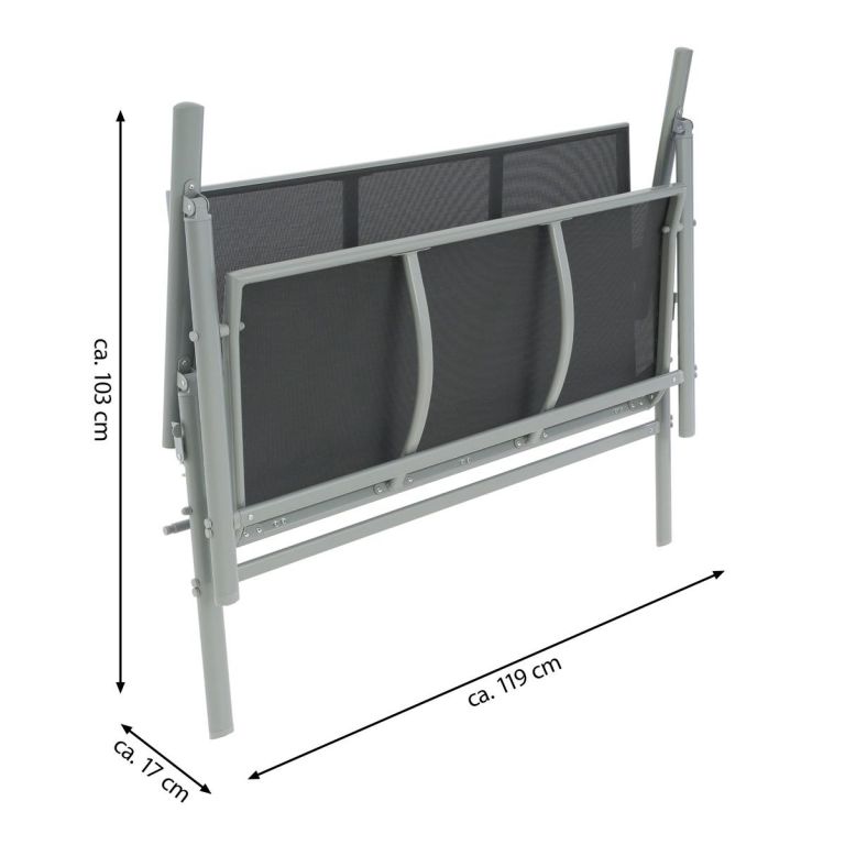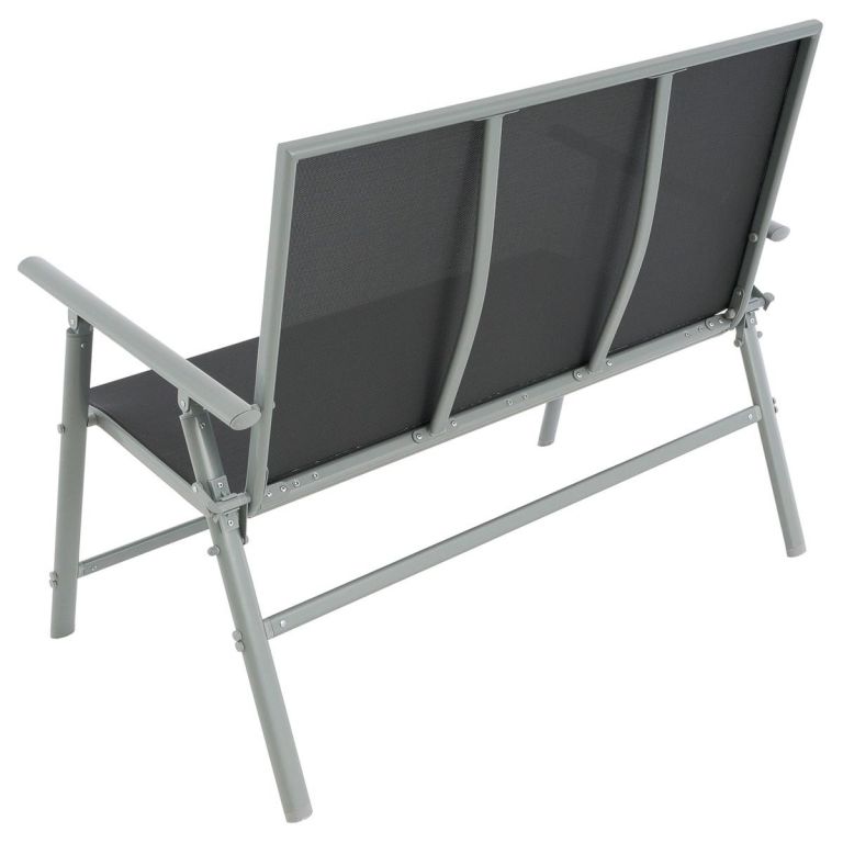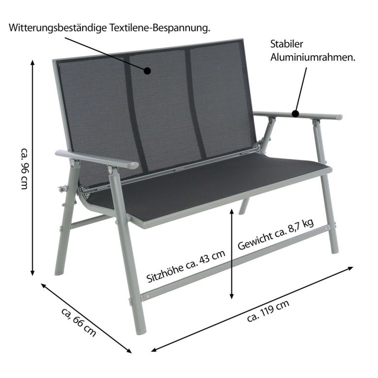 Tato krásná a stabilní zahradní lavička je ideální pro terasu, verandu, balkon, zimní zahradu nebo na zahradu. Lehká zahradní lavička v nadčasovém designu, kterou můžete samozřejmě také použít jako balkonovou lavici nebo na terasu. Lavička se skládá ze stabilního hliníkového rámu s černým potahem 2x2 textilu. Lavička je určena až pro 2 osoby, odolná proti povětrnostním vlivům, robustní, stabilní a lehká. Kromě toho je povrch velmi snadno ošetřitelný a nevyžaduje žádné speciální výrobky na péči. Montáž je provedena během okamžiku. Nerezový povrch díky hliníkovému rámu. Díky skládací funkci lze lavičku uložit prakticky kdekoliv.