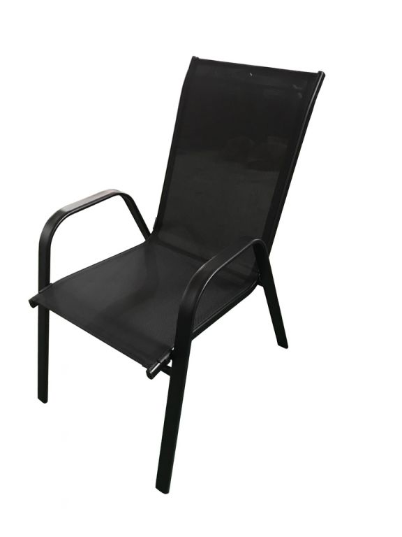 Křeslo s pevnou kovovou konstrukcí a čalouněním z umělé černé textilie pro venkovní využití.