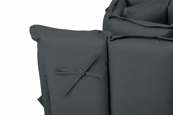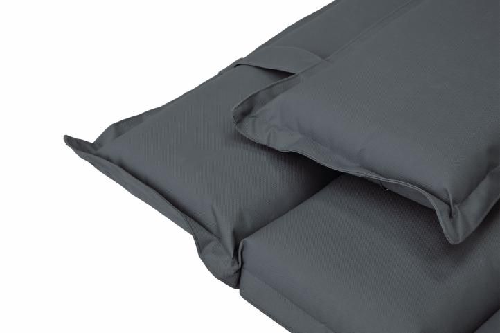 Polštář je připevněn 2 pásky na podložce a podle potřeby jej můžete sklopit dozadu. Dvěma upevňovacími pásky na zadní straně podložky upevníte podložku k lehátku.