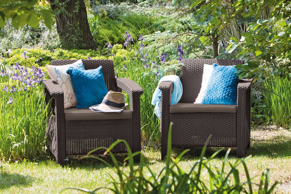 Set Corfu Duo se skládá ze dvou křesílek. Křesílka jsouzumělého plochého ratanu v barvě hnědá + šedohnědé podušky. Zahradní nábytek z umělého ratanu je odolný vůči různému počasí.