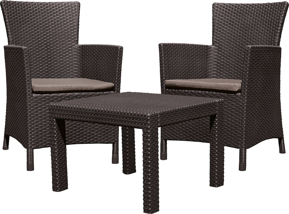 Rosario balcony je menší moderní posezení jak ven, tak do interiéru. Souprava je vyrobena z lisovaného plastu v imitaci plochého ratanu. Set je doplněn o podušky, které zajistí ještě větší pohodlí. Skládá se ze stolku a dvou křesílek, které mají vyšší opěrku. Jednoduchá montáž i údržba. Set jeodolný nepřízni počasí i UV záření.